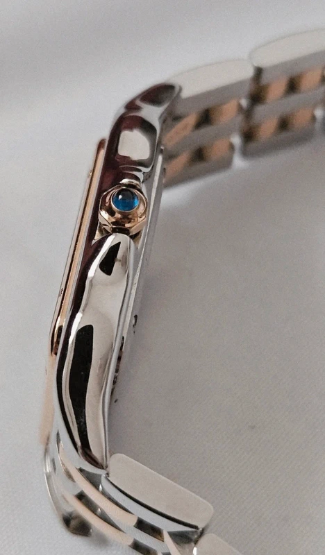 Montre Panthère de Cartier, moyen modèle, mouvement à quartz. Boîte en or jaune 750/1000 et acier, dimensions : 29 mm x 37 mm, épaisseur : 6 mm, couronne ornée d’un spinelle de synthèse bleu, cadran argenté, aiguilles en forme de glaive en acier bleui, bracelet en or jaune 750/1000 et acier, étanche jusqu’à 3 bar (environ 30 mètres).